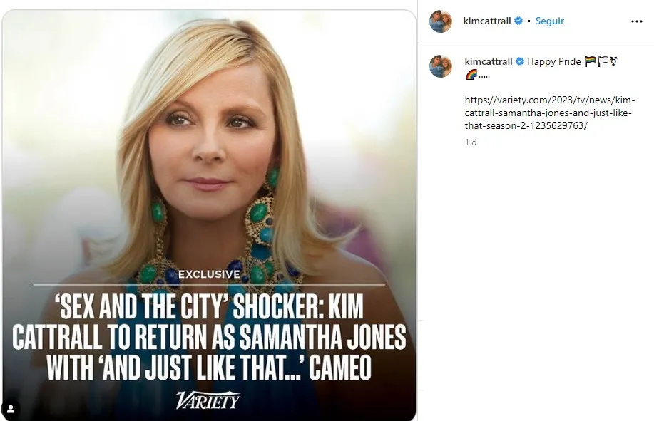 La noticia fue confirmada por la misma Kim Catrall que en su cuenta de Instagram compartió un registro de los medios reporteando su regreso con el mensaje “Feliz mes del orgullo”.