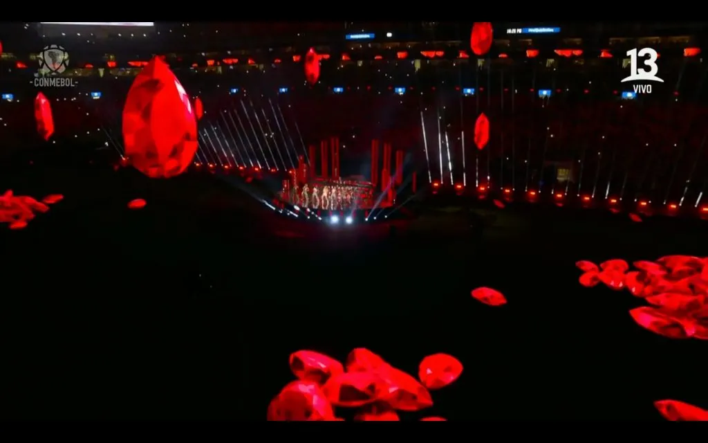 Bailes que llamaron la atención en el show, pero nada como las imágenes falsas que se mostraron en la cancha en la transmisión televisiva con una técnica que se usa llamada fake out of home; creando objetos brillantes emulando al Super Bowl; claro que en el futbol americano todo es real.