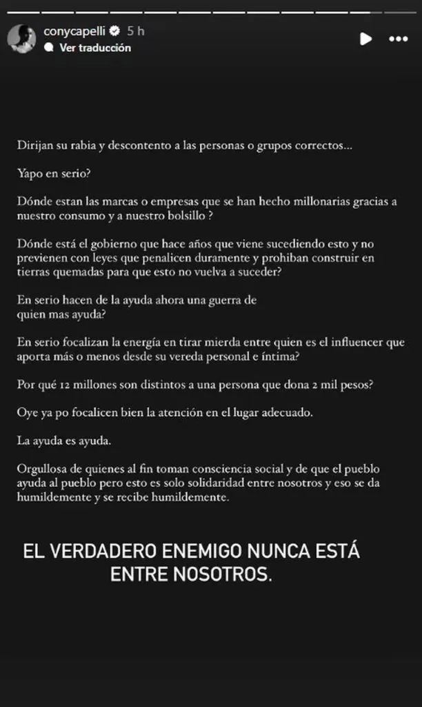 “En serio hacen de la ayuda ahora una guerra de quien mas ayuda? En serio focalizan la energía en tirar mierda entre quien es el influencer que aporta más o menos desde su vereda personal e íntima? Por qué 12 millones son distintos a una persona que dona 2 mil pesos?“, mencionó sobre el fenómeno que se ha dado con las críticas hacia las personas que no hacen pública su ayuda.