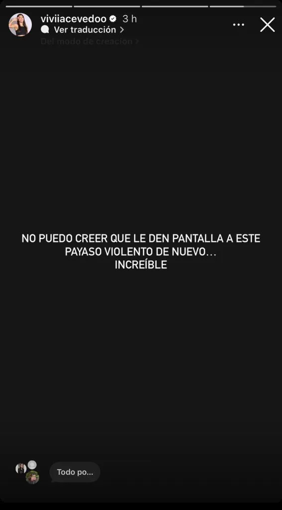 “No puedo creer que le den pantalla a este payaso violento de nuevo… Increíble“, escribió en una historia que solo contiene texto.