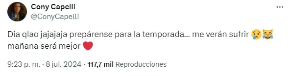 Eso no fue todo y es que además Cony también publicó un tweet en su cuenta oficial de X en dónde mencionó que: “Día qlo jajajaja prepárense para la temporada… me verán sufrir. Mañana será mejor“.