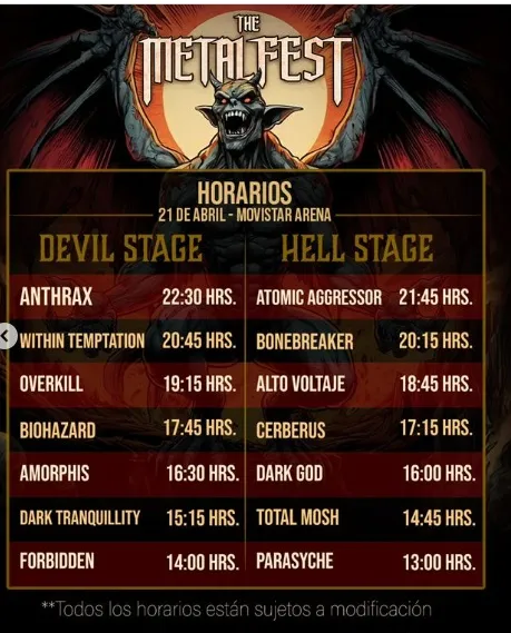 Metal Fest, el esperado festival musical, acaba de anunciar los horarios en que se presentarán las reconocidas bandas nacionales e internacionales sobre los escenarios Hell Stage y Devil Stage del Movistar Arena durante el 20 y 21 de abril.