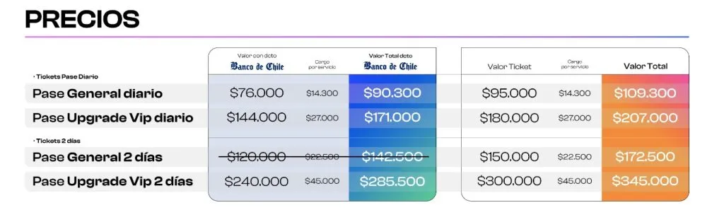 Sí, las entradas disponibles están a la venta a través de sistemas livetickets.cl. Los precios van desde los 109.000 pesos, correspondiente al pase diario, los clientes banco de Chile tienen un descuento quedan el valor en $90.300, mientras que el pase Upgrade Vip 2 días tiene un costo de $345.000 con cargo incluido, quedando en $285.500 para clientes Banco de Chile.