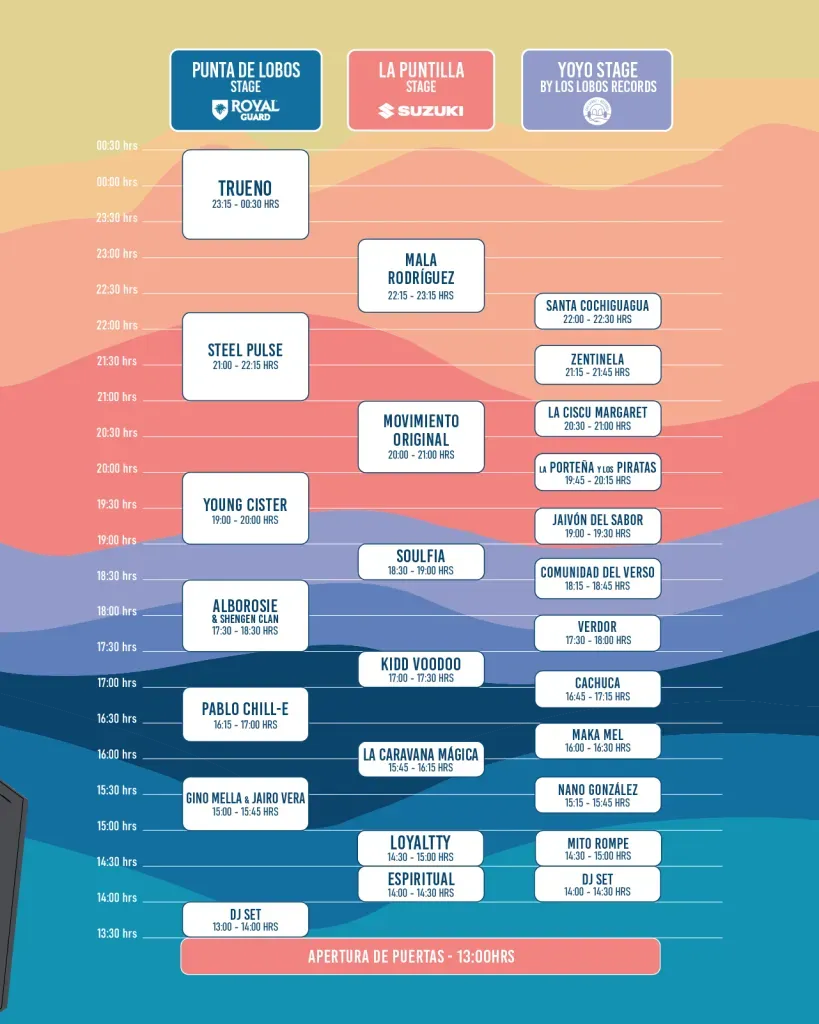 En la Punta de Lobos Stage, se presentará Gino Mella y Jairo Vera a las 15:00 horas, mientras que Pablo Chill-E encenderá los ánimos a las 16.45. Young Cister se subirá al escenario a las 19:00 horas, Steel Pulse a las 21:00 horas y cerrando la jornada estará Trueno a las 23:15.