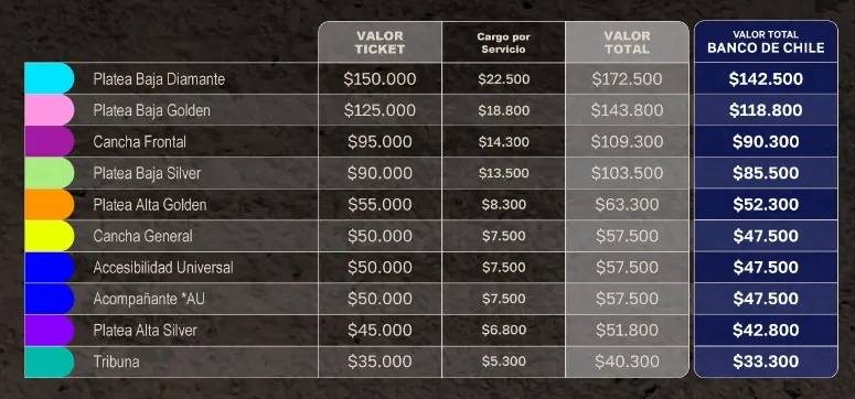 En venta general la entrada más económica tiene un costo de $40.300 correspondiente a Tribuna, seguida de Platea Alta Silver a $51.800, Cancha General tiene un costo de $57.500. Platea Alta Golden tiene un valor de $63.300, mientras que Platea Baja Silver cuesta $103.500.