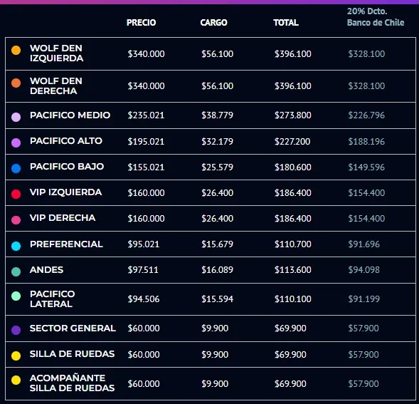 - Vip derecha: $186.400 / con 20% $154.400