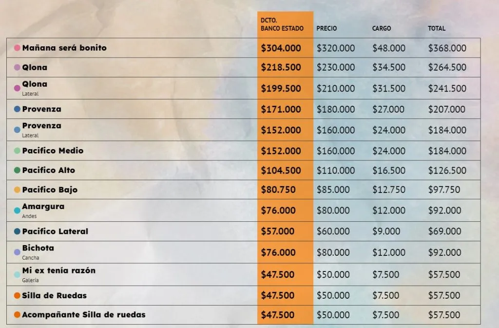 Para poder ver a la estrella de la música, hay distintas localidades que van desde los 57.500 correspondientes a Galería “Mi ex tenía razón”, mientras que Andes, “Amargura”, tiene un valor de 92.000. La localidad más cara tiene un costo de $368.000 correspondiente a “Mañana será Bonito”.