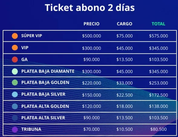 Mientras que el ticket abono 2 días tiene un valor $80.500 por la ubicación Tribuna, hasta los $575.000 por la ubicación Super Vip.