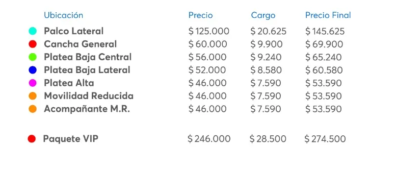 El valor de las entradas oscila entre los $53.590 correspondiente a la ubicación platea baja, mientras que la localidad más cara “Palco Lateral” tiene un costo de $145.000.
