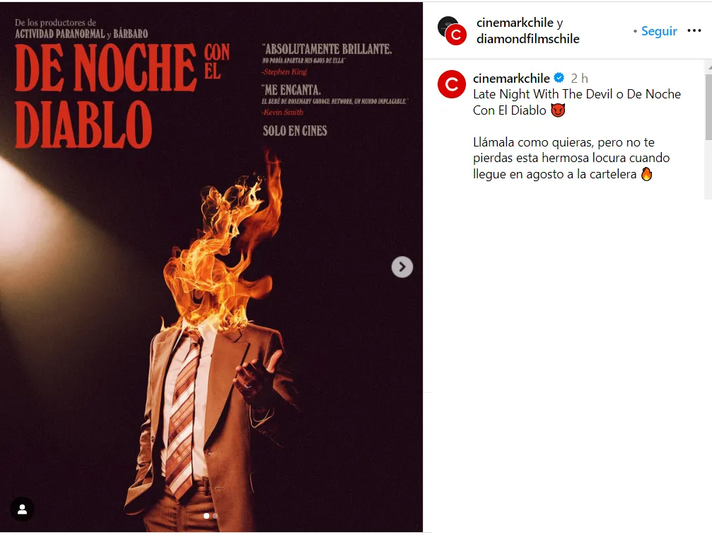 “Late Night With The Devil”, escrita y dirigida por el dúo australiano Colin y Cameron Cairnes, presenta una narrativa original que se desarrolla casi en tiempo real. La transmisión en vivo de 1977 de un programa de entrevistas nocturno se transforma de manera inesperada de divertida a extraña y siniestra, cambiando la vida de los televidentes.