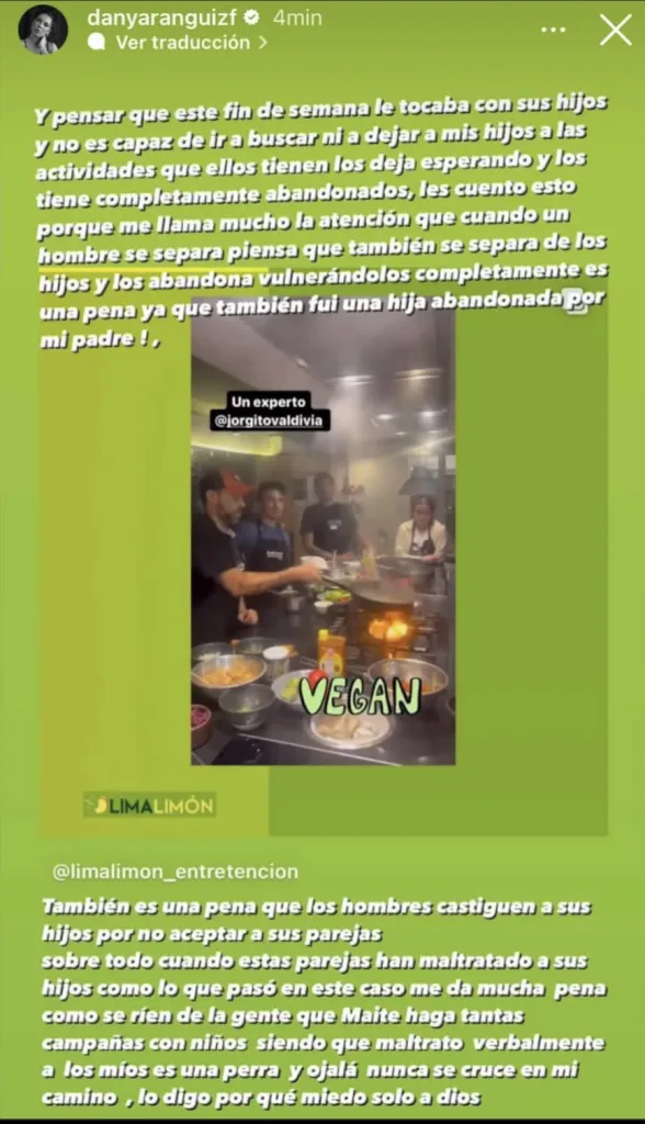“También es una pena que los hombres castiguen a sus hijos por no aceptar a sus parejas. Sobre todo cuando estas parejas han maltratado a sus hijos como lo que pasó en este caso. Me da mucha pena como se ríen de la gente, que Maite haga tantas campañas con niños siendo que maltrató verbalmente a los míos. Es una perra y ojalá nunca se cruce en mi camino, lo digo porque miedo solo a dios”.