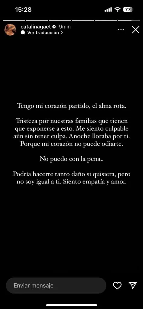 Finalmente destaca que siente pena por sus familias y también culpa, destacando que “Podría hacerte tanto daño si quisiera, pero no soy igual a ti. Siento empatía y amor“.