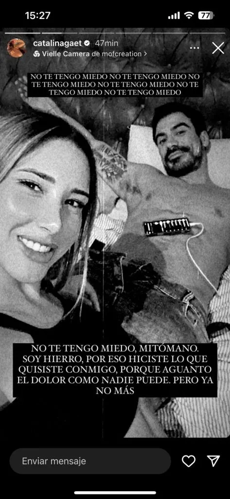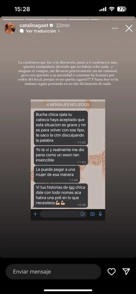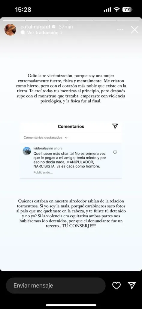 Mediante historias en su cuenta de Instagram, la influencer Catalina Gaete decidió publicar una serie de ocho historias con texto defendiéndose y al mismo tiempo funando al chico reality. De estas seis las dos primeras ya fueron borradas de su Instagram, dejando solo las últimas seis.