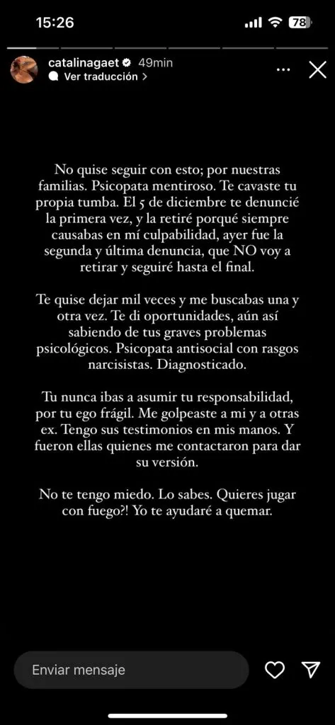 “No quise seguir con esto; por nuestras familias. Psicópata mentiroso. Te cavaste tu propia tumba. El 5 de diciembre de denuncié la primera vez y la retiré porque siempre causabas en mí culpabilidad, ayer fue la segunda y última denuncia, que NO voy a retirar y seguiré hasta el final“, mencionó en su primera historia, misma en la que añadió que trato de dejarlo varias veces pero que volvía con él debido a sus manipulaciones.