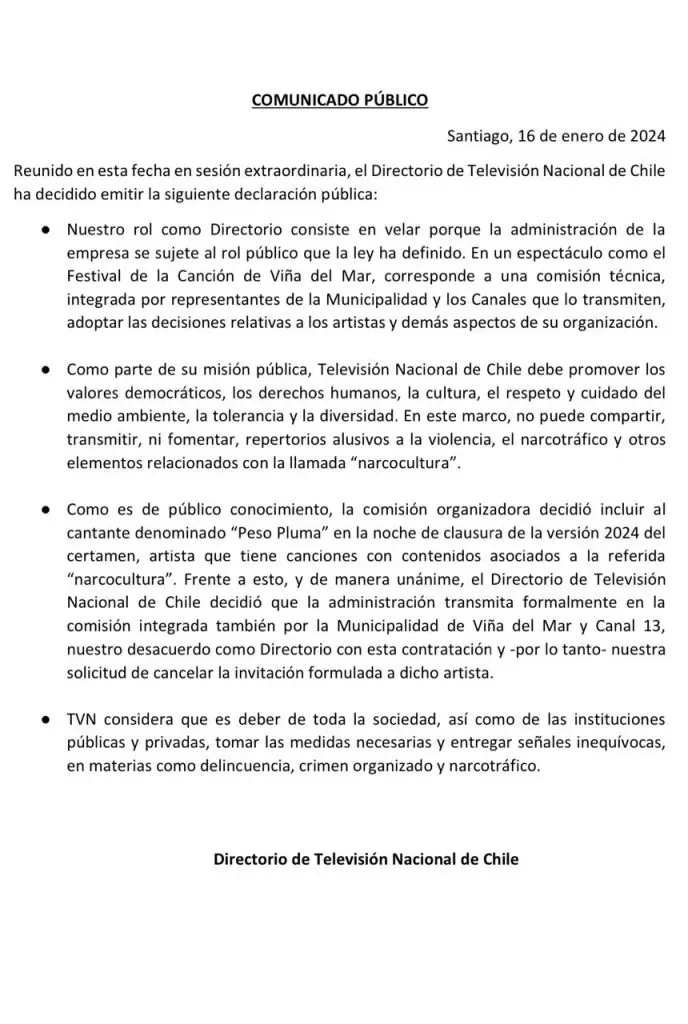 cantante denominado “Peso Pluma” en la noche de clausura de la versión 2024 del certamen, artista que tiene canciones con contenidos asociados a la referida “narcocultura”. Frente a esto, y de manera unánime, el Directorio de Televisión Nacional de Chile decidió que la administración transmita formalmente en la