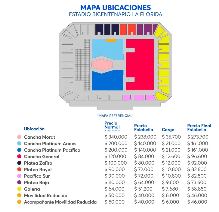 Debido al éxito de la primera venta de entradas se han habilitado nuevas localidades numeradas en las zonas de Tribuna Andes y Tribuna Pacífico, ambas tienen un costo de $150.000 con cargo incluido y los tickets están disponibles en Ticketmaster.cl.