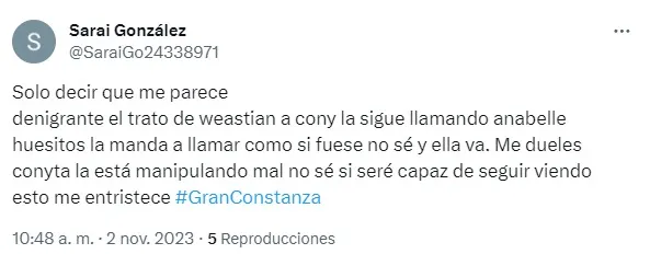 Esta situación no dejó contentos a muchos y es que los fanáticos de la bailarina reaccionaron de mala manera ante este nuevo acercamiento de Sebastián. Y es que el chico reality sigue, según los usuarios, manipulando y usando a Constanza. Pero eso no es todo ya que el mismo participante continúa tratándola de “Annabelle” y no por su nombre real.
