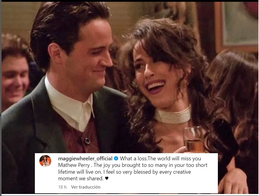 Maggie Wheeler, quien interpretó a Janice, la ex novia de Chandler durante gran parte de la serie, escribió en Instagram una emotiva despedida al actor, acompañada de una imagen de la serie en donde aparecen sus personajes durante la primera temporada.