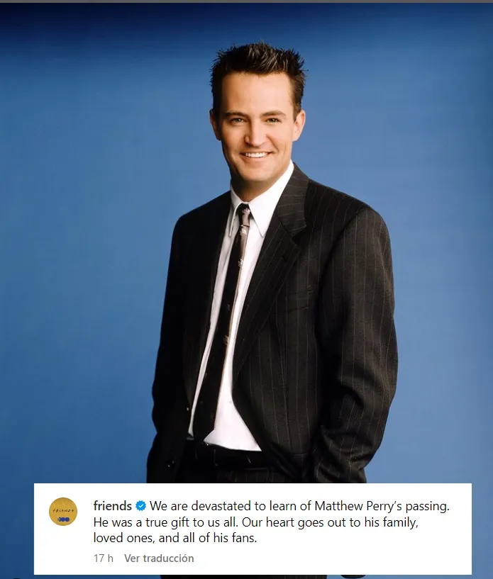 La página oficial de Friends en Instagram también despidió al querido actor. “Estamos devastados al enterarnos del fallecimiento de Matthew Perry. Fue un verdadero regalo para todos nosotros. Nuestro corazón está con su familia, sus seres queridos y todos sus fanáticos”.