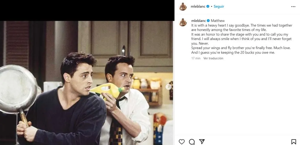 Su muerte golpeó fuertemente a sus compañeros de elenco y amigos, Jennifer Aniston, Courteney Cox, David Schwimmer y Lisa Kudrow, quienes no se habían pronunciado públicamente, hasta ahora, cuando Matt LeBlanc, quien interpretó a Joey Tribiani, le dedico sentidas palabras a Perry.
