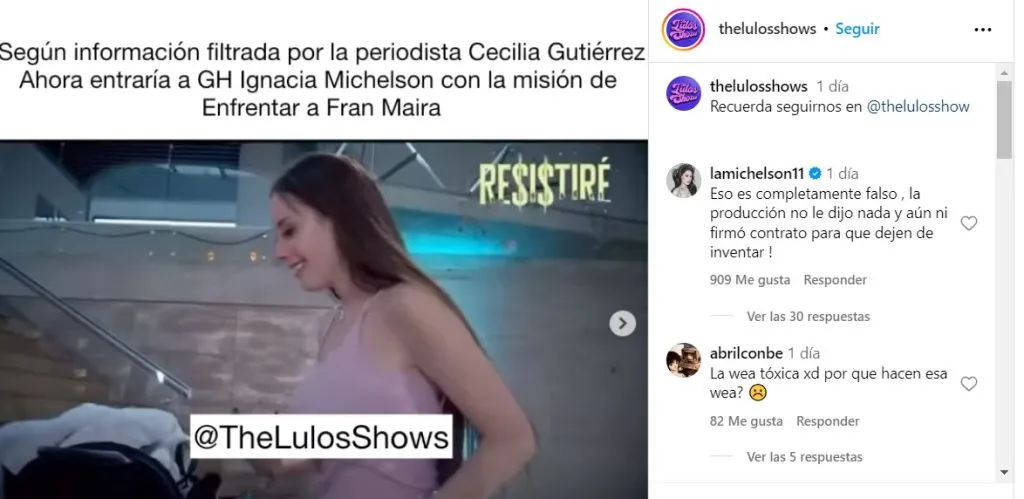 Luego de que estos dichos fueron replicados en distintos portales, fue Ignacia quien alzó la voz y puso fin a los rumores. “Eso es completamente falso. La producción no le dijo nada y aún no firmó contrato, para que dejen de inventar”, comentó en la publicación de la cuenta Thelulosshow.