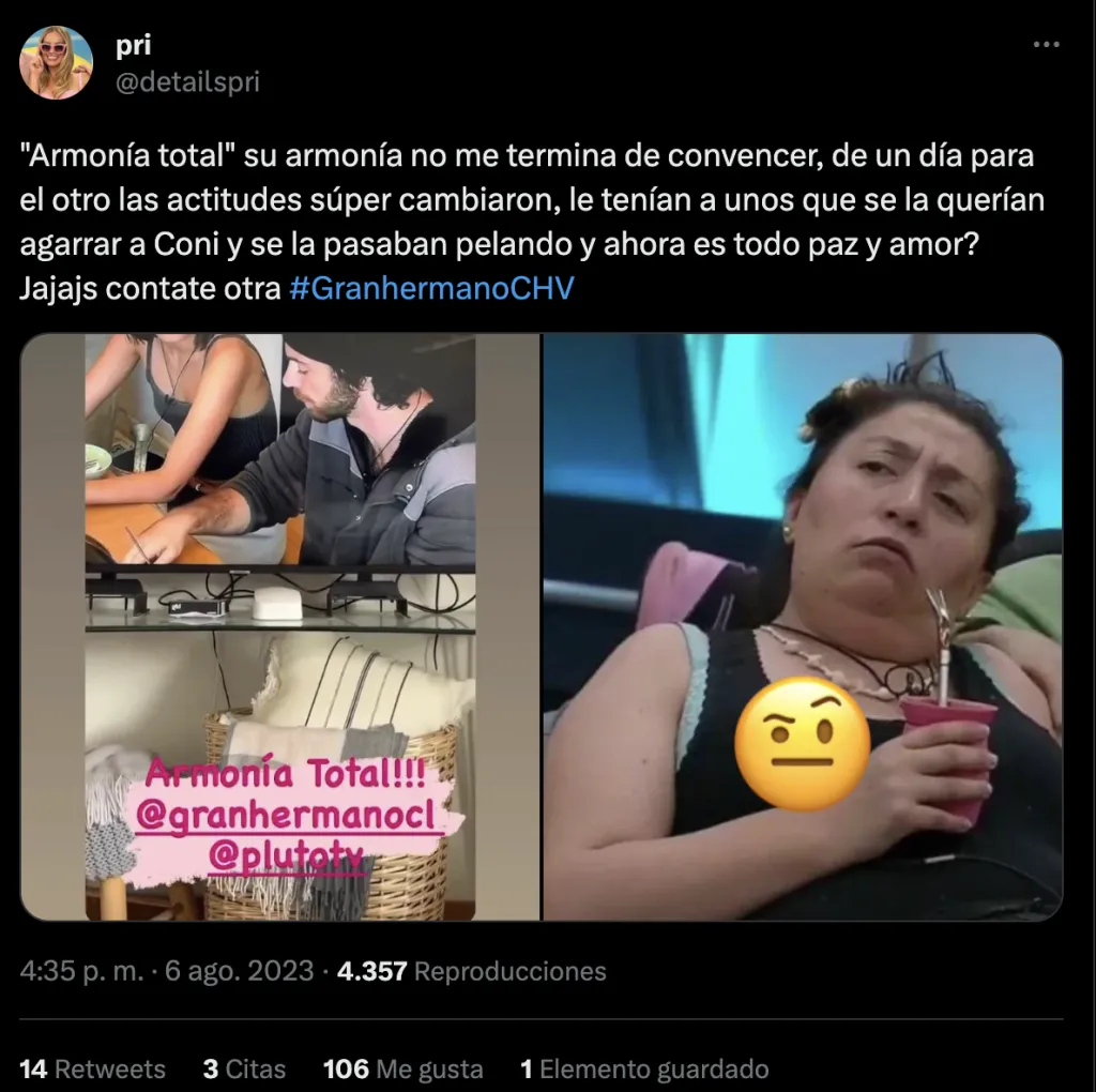 Pero la teoría del último día tiene que ver con el trato a Constanza en el reality. Hace unos días era lejos la más votada (de hecho está en placa) y tenía el desprecio de sus compañeros, pero desde la salida de Sebastián todos volvieron a acercarse a la participante en una extraña e inesperada armonía en el programa que tiene solo a la Pincoya alejada del resto.