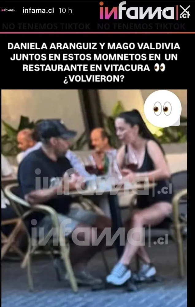 El portal Infama compartió la imagen señalando: “Daniela Aránguiz y Mago Valdivia juntos en estos momentos en un restaurante en Vitacura. ¿Volvieron?”.