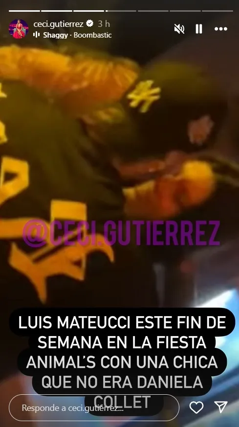 “Luis Mateucci este fin de semana en la fiesta Animal’s con una chica que no era Daniela Colett”, escribió en sus redes sociales la comunicadora junto con la imagen.
