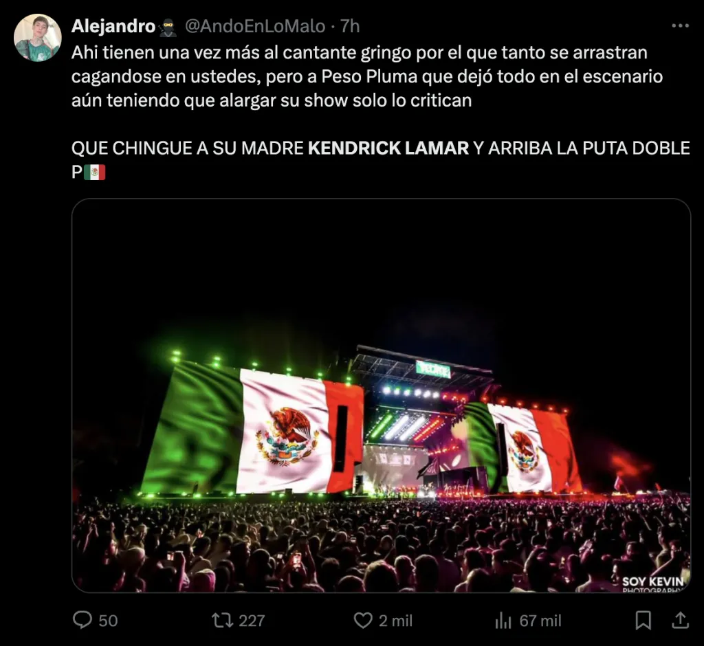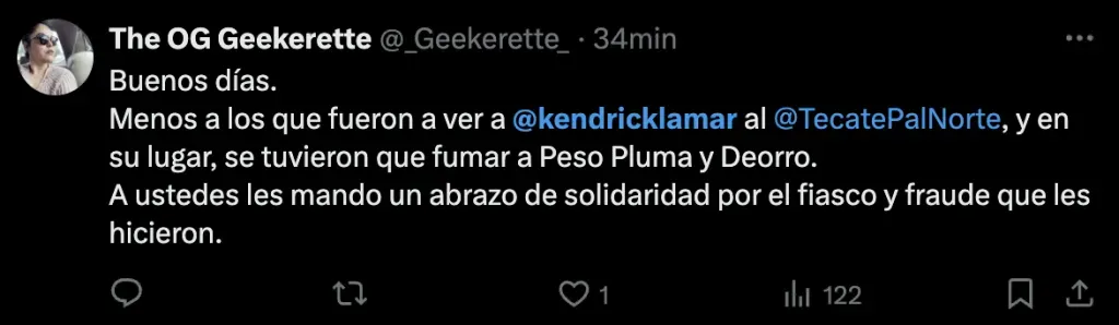 “Por problemas logísticos ajenos a la organización de Tecate Pa’l Norte, lamentamos informar que Kendrick Lamar no podrá presentarse en el festival esta noche”, fue el comunicado donde también agradecieron a Peso Pluma por extender su show.