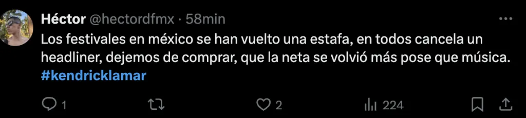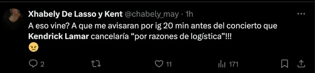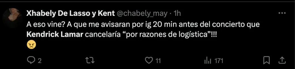 Terrible noticia para los mexicanos que en masa se volcaron a las redes sociales a criticar tanto al rapero como a la poca antelación del aviso. Esto porque muchos esperaban ver a Kendrick en la noche y otros hasta solo compraron su entrada por él.