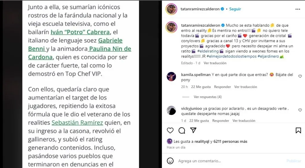 Tras lo polémico que resultó que sonará su nombre para la segunda temporada de Gran Hermano Chile es que Tatan Ramírez decidió tomarse sus redes sociales, algo que está acostumbrado a hacer, para así resolver la duda de algunos de sus fanáticos.