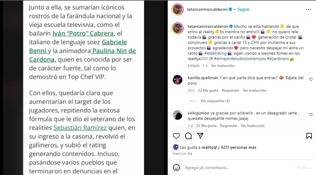 Finalmente, el ex Resistiré informó en un post que se encuentra fijado en su cuenta de Instagram que no tiene intenciones de ingresar a Gran Hermano Chile 2, desmintiendo cualquier tipo de rumor al respecto.