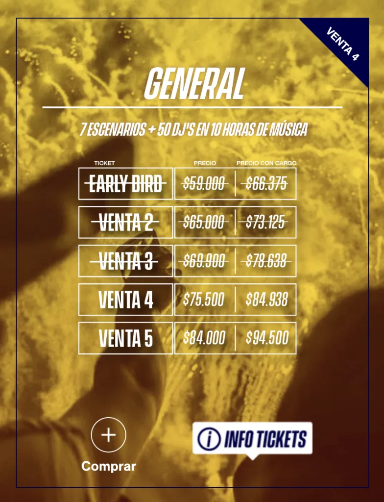 En Hospitality Village quedan más entradas, que van desde los 134 mil a 154 mil pesos. Mientras que en VIP Deck solo quedan de la última venta con un valor de 209 mil pesos.