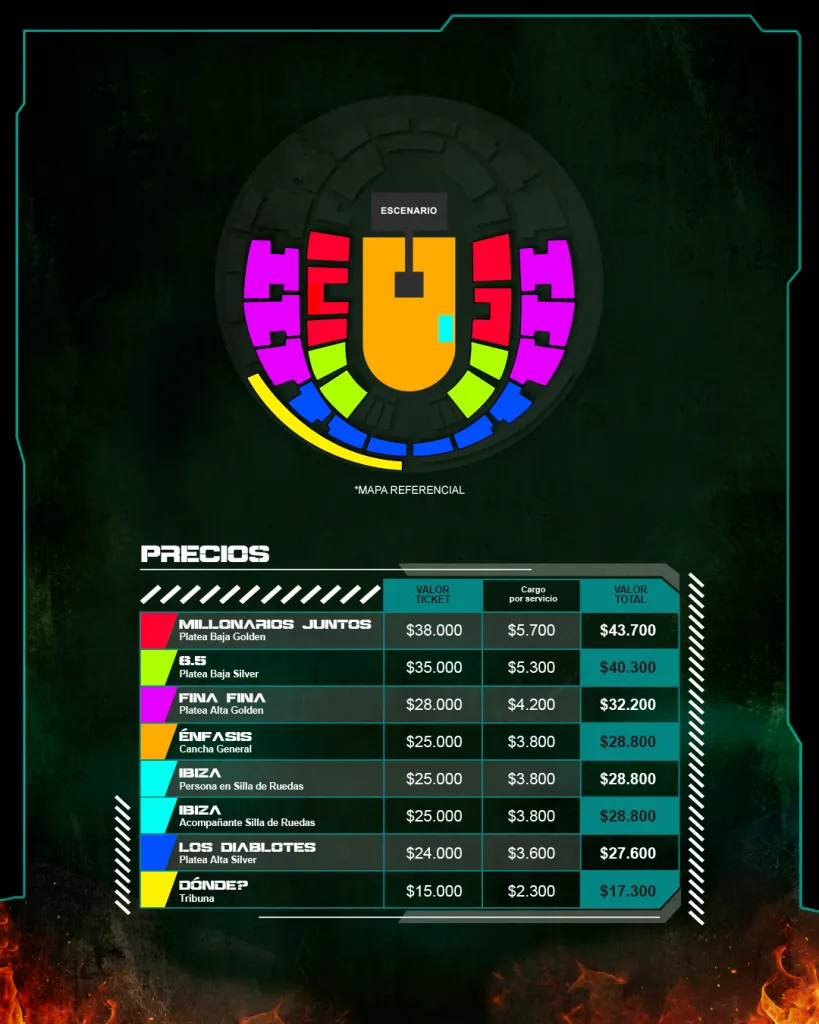 Los valores de entradas giran al rededor de los $15 mil pesos como la entrada más económica y la más cara tiene un costo de $38 mil pesos.
