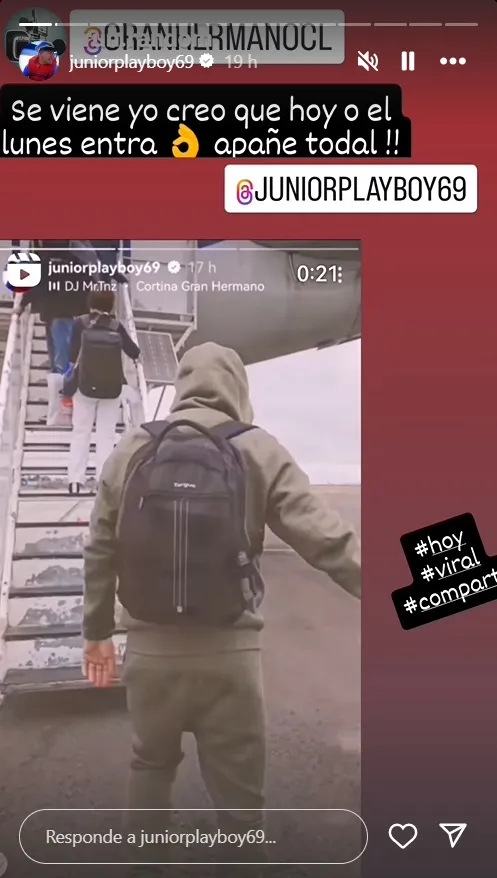 A través de sus historias de Instagram, José Luis Concha, también conocido como Junior Playboy publicó un registro de él subiéndose a un avión con la música de Gran Hermano de fondo.