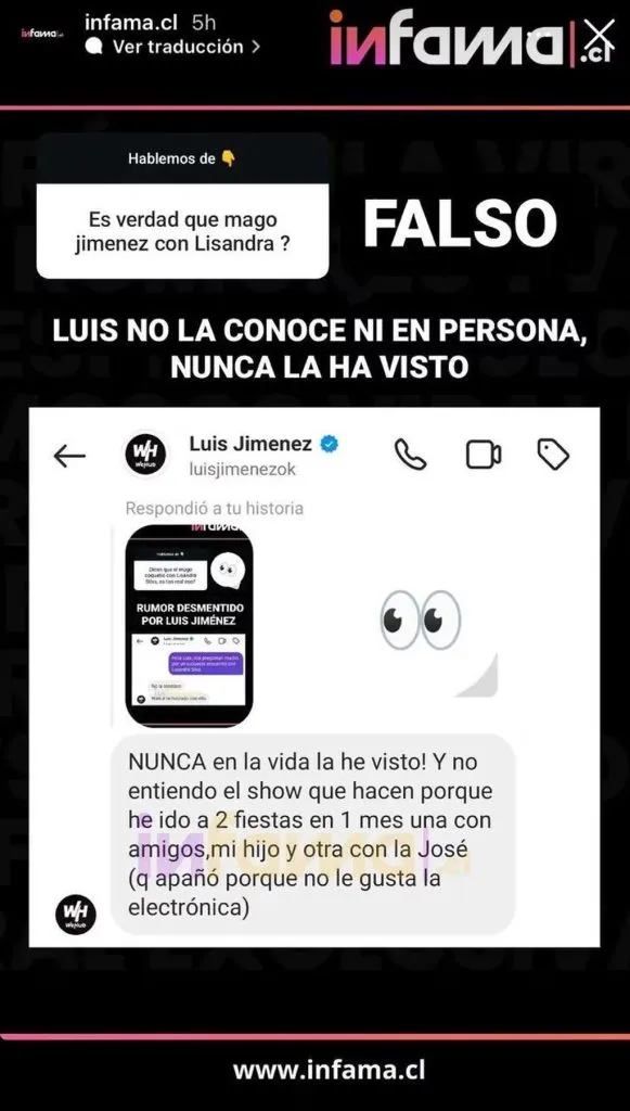 Tras esto, el portal Infama se comunicó con el ex futbolista, compartiendo con sus seguidores la respuesta. “No la conozco, nunca he hablado con ella”, contestó, para luego agregar: “Nunca en la vida la he visto. Y no entiendo el show que hacen porque he ido a 2 fiestas en 1 mes, una con amigos, mi hijo y otra con la Jose (que apañó porque no le gusta la electrónica)”, puntualizó.
