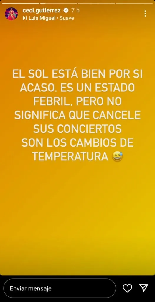 “El Sol está bien por si acaso. Es un estado febril, pero no significa que cancele sus conciertos. Son los cambios de temperatura“, se leía en su historia.
