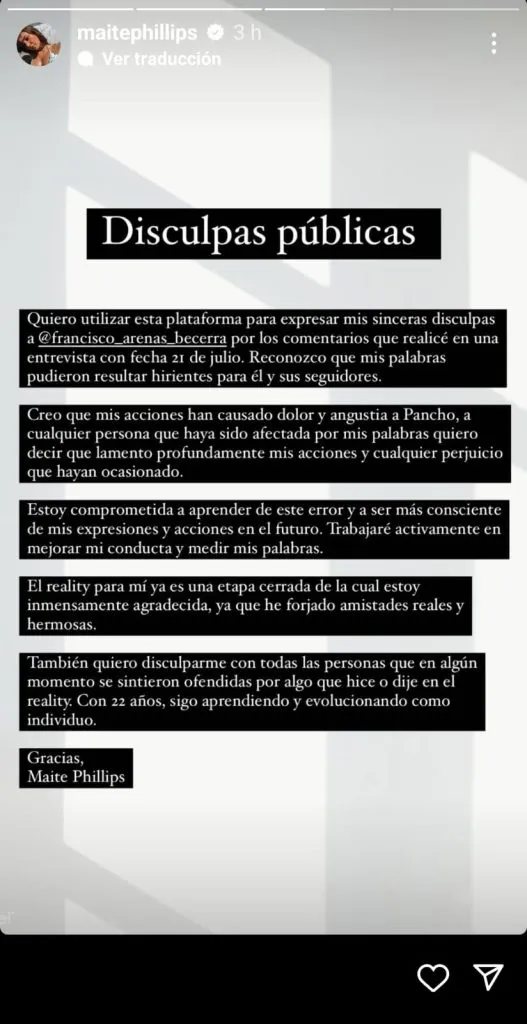 Esto, sumado a otros comentarios, le trajo problemas, lo que la llevó a pedir disculpas públicas mediante su cuenta de instagram @maitephillips.