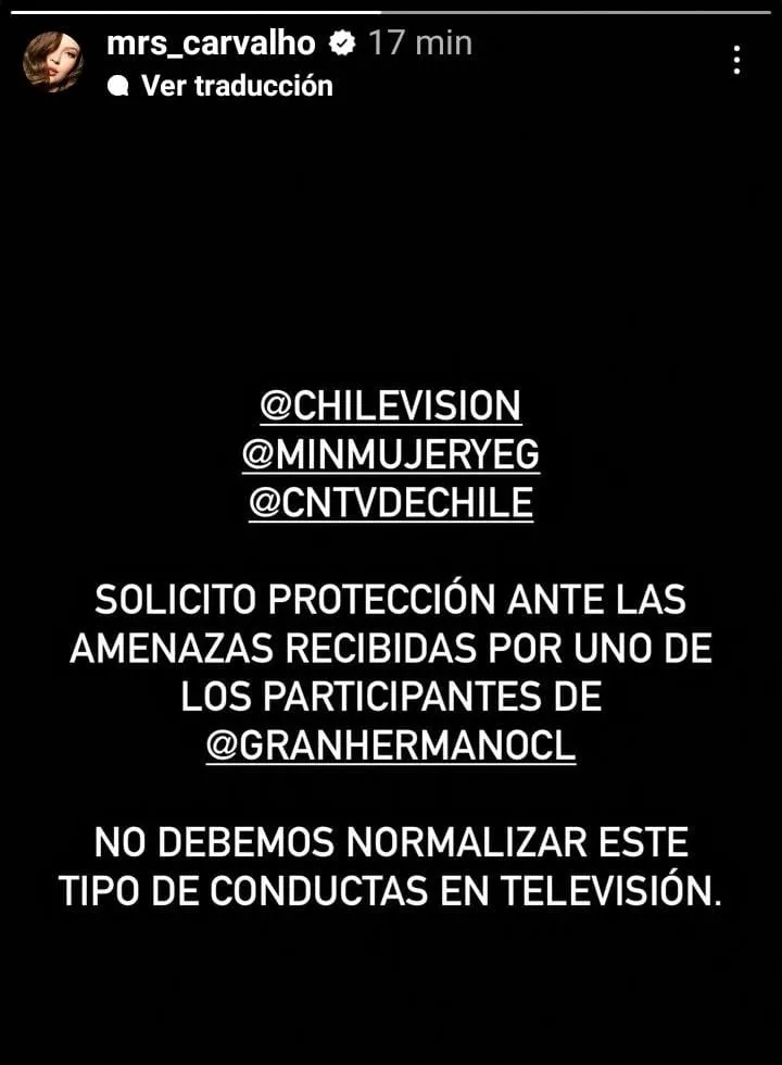A través de redes sociales, los administradores de las cuentas de Michelle se pronunciaron respecto a lo ocurrido. “Solicito protección ante las amenazas recibidas por uno de los participantes de Gran Hermano. No debemos normalizar este tipo de conductas en televisión”.