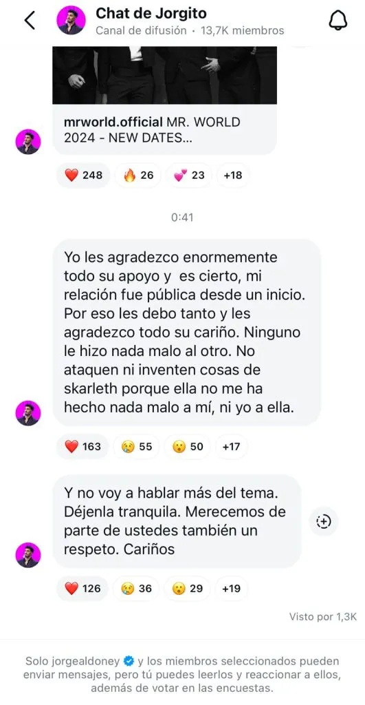 “Yo les agradezco enormemente todo su apoyo y es cierto, mi relación fue pública desde un inicio. Por eso les debo tanto y les agradezco todo su cariño. Ninguno le hizo nada malo al otro. No ataquen ni inventen cosas de Skarleth porque ella no me ha hecho nada malo a mí, ni yo a ella“, escribió Jorge.