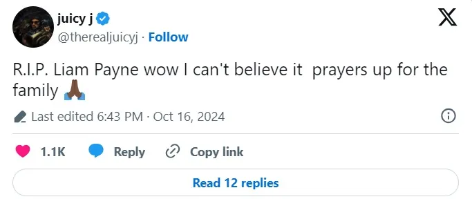 El cantante Juicy J escribió: “No puedo creerlo. Mis oraciones para su familia”.