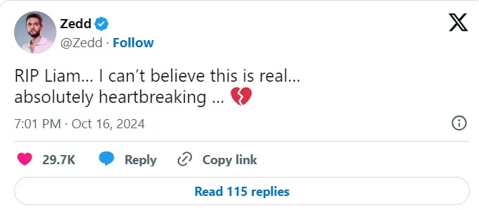 El artista Zedd escribió en X “Descansa paz Liam, no puedo creer que esto es real. Absolutamente devastador”.