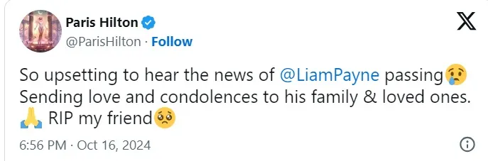 Por su parte, la socialité Paris Hilton escribió: “Triste de escuchar las noticias sobre la muerte de Liam Payne. Enviando mi amor y condolencia a su familia y seres queridos. Descansa en paz mi amigo.