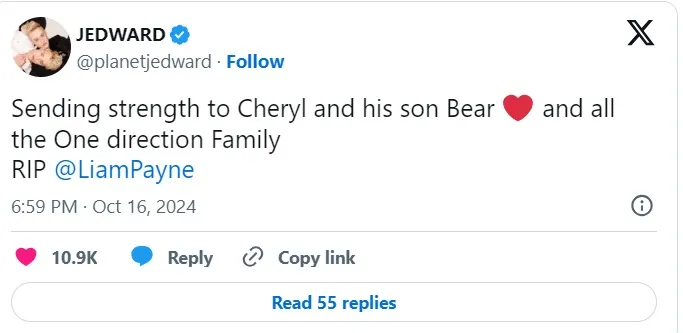 El dúo irlandés Jedward escribió: “Enviamos fuerza a Cheryl y su hijo Bear y a toda la familia One Direction. Descansa en paz Liam”.