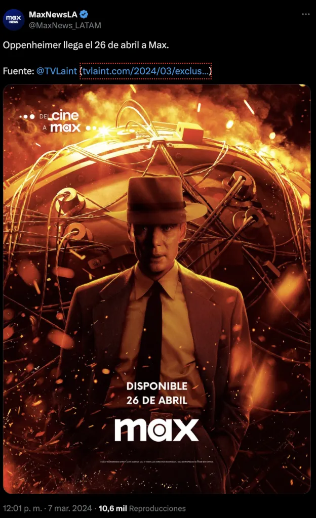 El medio explica que Oppenheimer llegará a Max pero no sería lo único, ya que incluso dan la programación de cómo será estrenada en televisión.