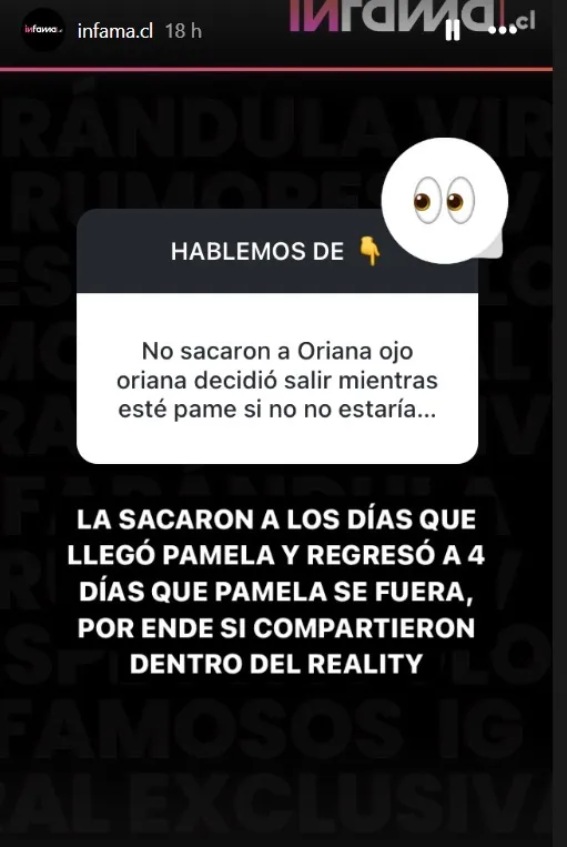 “La información que yo tengo es que Oriana hoy día no está dentro de la casa, más Pamela sí, y esto se debe a que Oriana habría presentado un cuadro de salud que la tiene hoy en día imposibilitada para continuar con las actividades propias del reality”, señaló Hugo Valencia en Zona de Estrellas en mayo pasado.