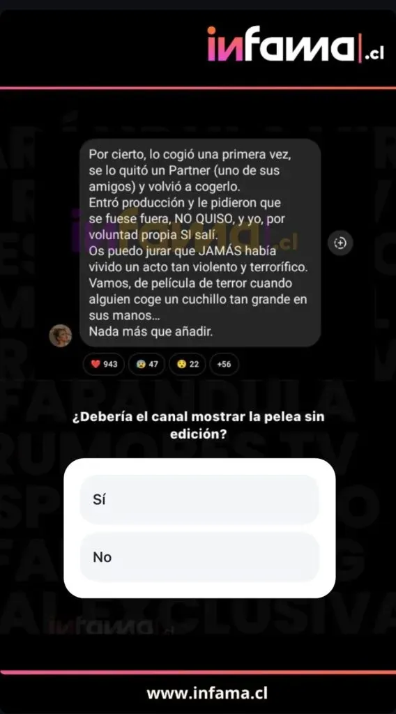 El medio Infama reveló, con fotos, que Oriana envió un mensaje a su canal de difusión en Instagram, el que ya no se encuentra disponible, una amenaza hecha por Pamela durante su pelea en el encierro.