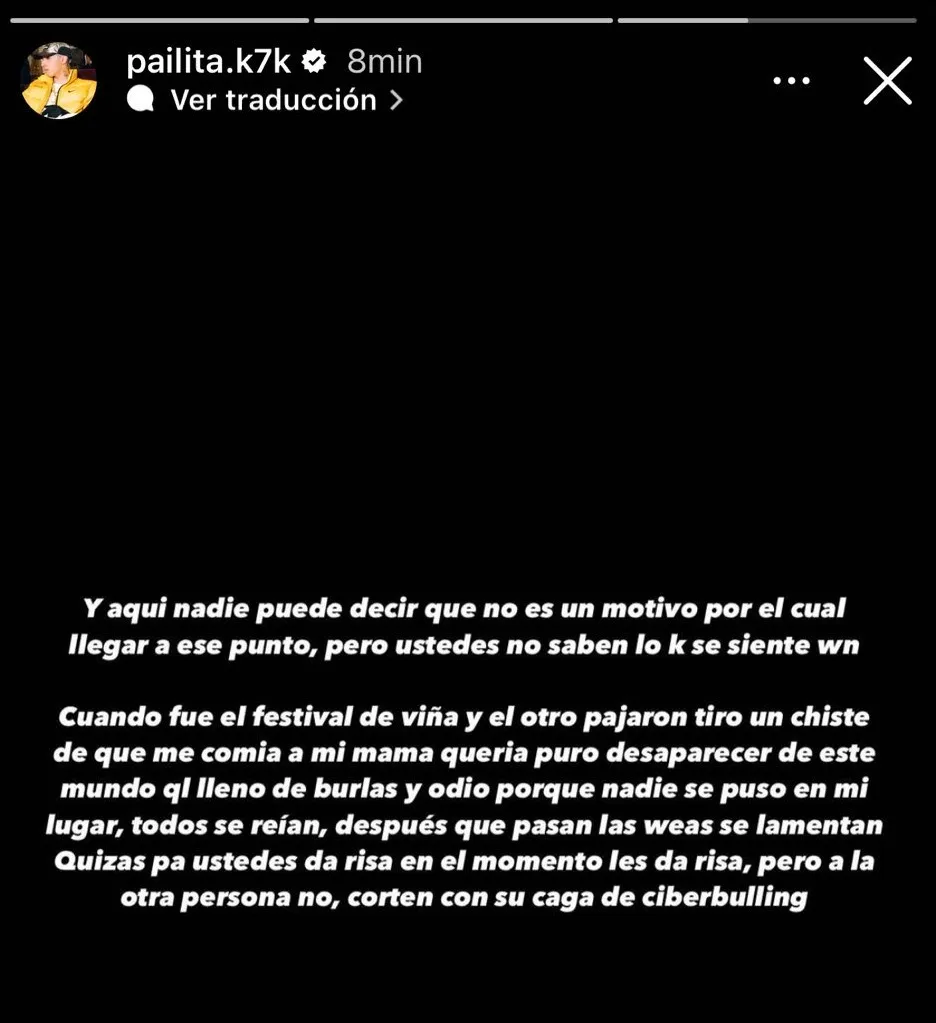 “Y aquí nadie puede decir que no es un motivo por el cual llegar a ese punto, pero ustedes no saben lo que se siente“, comenzó señalando, para luego agregar: “Cuando fue el Festival de Viña y el otro pajarón tiró un chiste de que me comía a mi mamá, quería puro desaparecer de este mundo lleno de burlas y odio porque nadie se puso en mi lugar”.