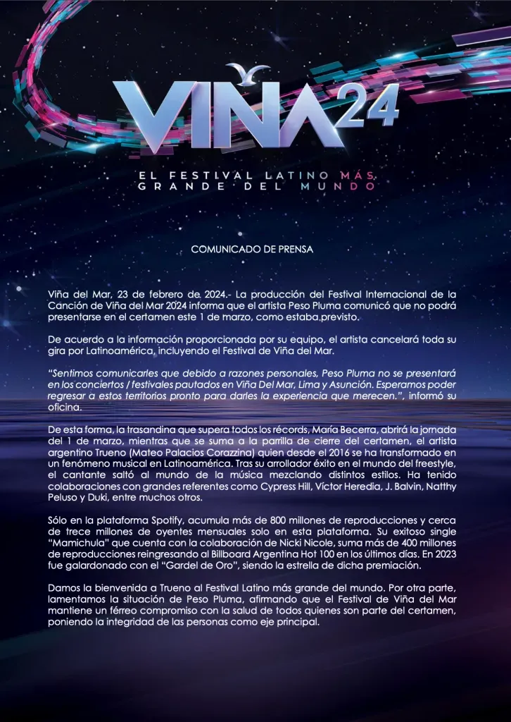 “Sentimos comunicarles que debido a razones personales, Peso Pluma no se presentará en los conciertos / festivales pautados en Viña Del Mar, Lima y Asunción. Esperamos poder regresar a estos territorios pronto para darles la experiencia que merecen.”