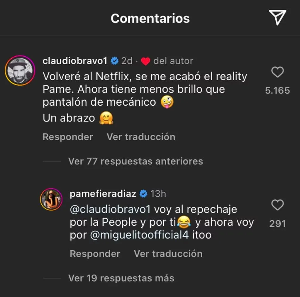 En una publicación de Instagram, Claudio Bravo le comentó un simpático y tierno mensaje de apoyo por su participación en Tierra Brava “Volveré al Netflix, se me acabó el reality Pame. Ahora tiene menos brillo que pantalón de mecánico. Un abrazo“, le dejó el arquero.